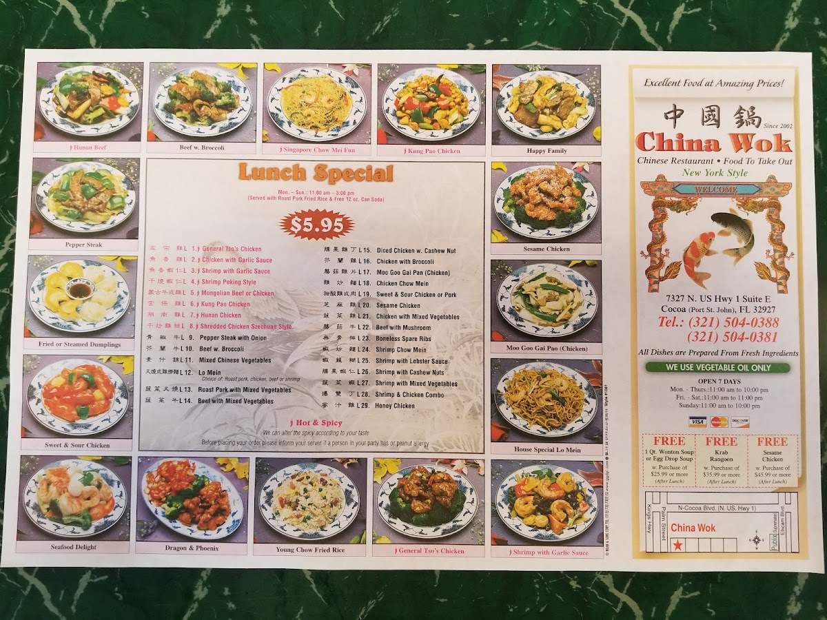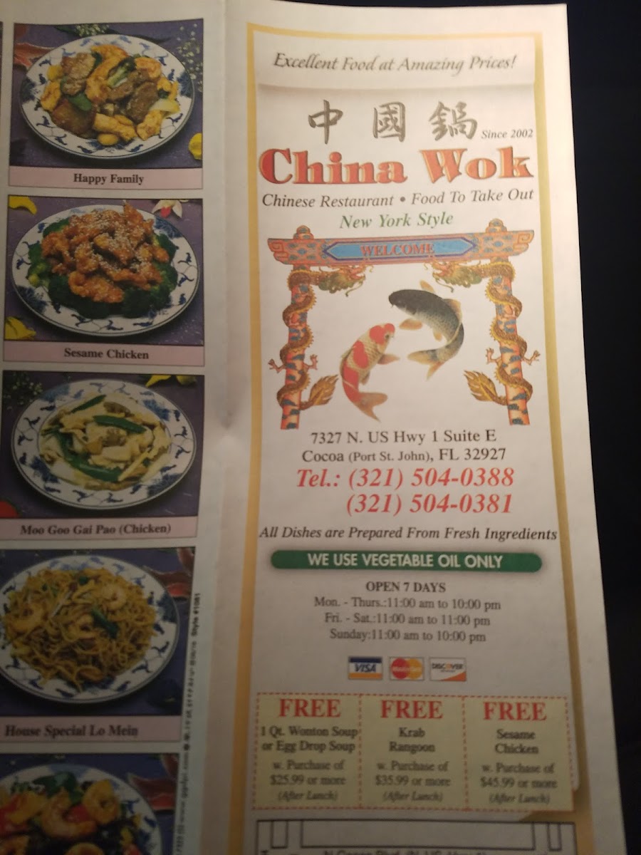 Welcome to China Wok, a hidden gem situated at 7327 US-1 E, Port St John, FL. This charming Chinese restaurant has garnered a loyal following for its flavorful dishes and welcoming service. Among the standout items are the Bourbon Chicken and General Tso's Chicken, both celebrated for their tender meat and rich sauces that dance on the palate. Customers rave about the generous portions, with favorites like Fried Rice and Lo Mein overflowing with fresh ingredients.